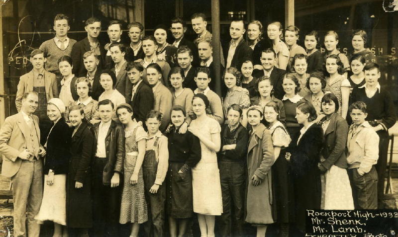 "Rockport High School 1933-Probably all grades represented. Teachers-Mr. Shenk & Mr. Lamb"